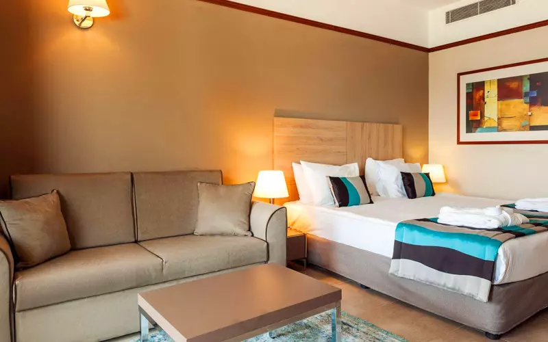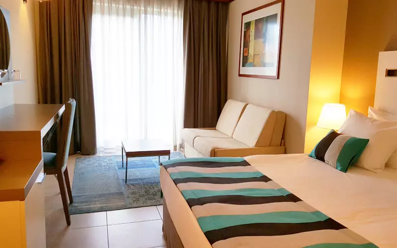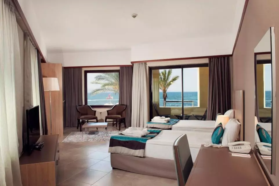 اتاقهای این هتل با طراحی داخلی مدرن و فضایی دلنشین، محیطی راحت و دلپذیر را برای اقامت مهمانان فراهم کردهاند. از رنگآمیزی دیوارها گرفته تا انتخاب مبلمان و چیدمان دقیق هر بخش از اتاق، همه چیز در جهت ایجاد حس راحتی و لوکس بودن در نظر گرفته شده است. هر اتاق به گونهای طراحی شده که علاوه بر زیبایی بصری، فضایی کاربردی و آرام برای استراحت ایجاد کند. پنجرههای بزرگ در بسیاری از اتاقها نمایی نفسگیر از دریای آبی و باغهای سرسبز اطراف را به نمایش میگذارند که تجربه اقامت را به سطحی بالاتر میبرد.
